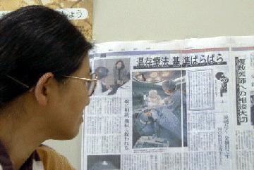 順さんとは新宿で待ち合わせ。順さんは予定よりも一つ速い電車で着いていた。10時少し回ったところでO駅に到着。絶食だが、飲み物はOKという指示があったので、順さんはコーヒーでもという話だったが、刺激物で避けたかったのと、もしかしたら欠席や遅刻で順番がさきになるかも知れないと感じたから。しかしこの直感は半分当たったものの、最終的なA医師の順番は当初の通りとなって一番最後となった。[A医師の手術が掲載されている記事を読む順さん]